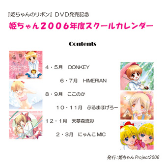 | ■「はぁはぁWORKS」たけやぶ 新刊「5さいなんだからねっ!」(成人向け:B5:P40:表紙カラー) 「アニマル横町」(あみちゃん&くーちゃん)と「愛してるぜベイベ」(ゆずゆちゃん)の本。 ■姫ちゃんコミュニケーション 「姫ちゃんコミュニケーション記念本」 「2006年姫ちゃんスクールカレンダー」 ![]() 執筆者:DONKEY、HIMERIAN、ここのか、ぶるまほげろー、天夢森流彩、にゃんこMIC ■サークル・ハンサム団 「ヒメリの餡」(2006年4月2日発行:姫ちゃんのリボン本) 執筆者:HIMERIAN、フリードリッヒ伊谷、天夢森流彩、ポコ太 |